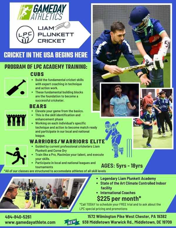 Liam Plunkett USA Cricket programs at Gameday Athlete support the rapid growth of cricket across the United States. Based in Pennsylvania, we work with youth players, competitive athletes, and cricket organizations seeking elite coaching rooted in international experience.